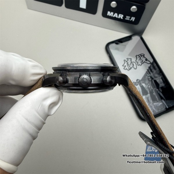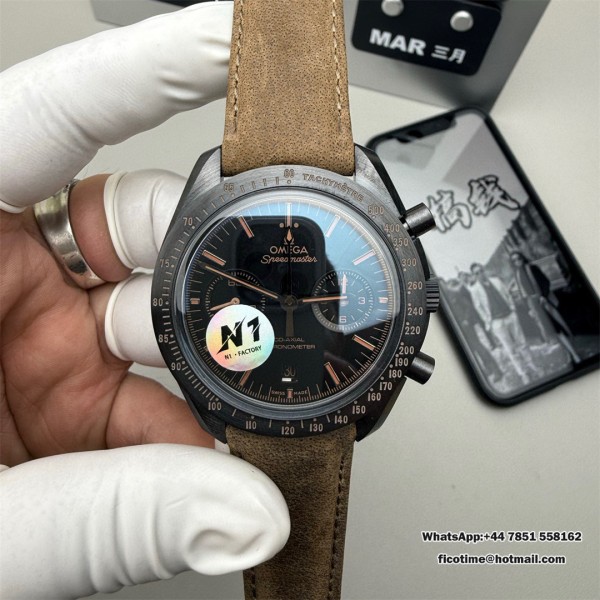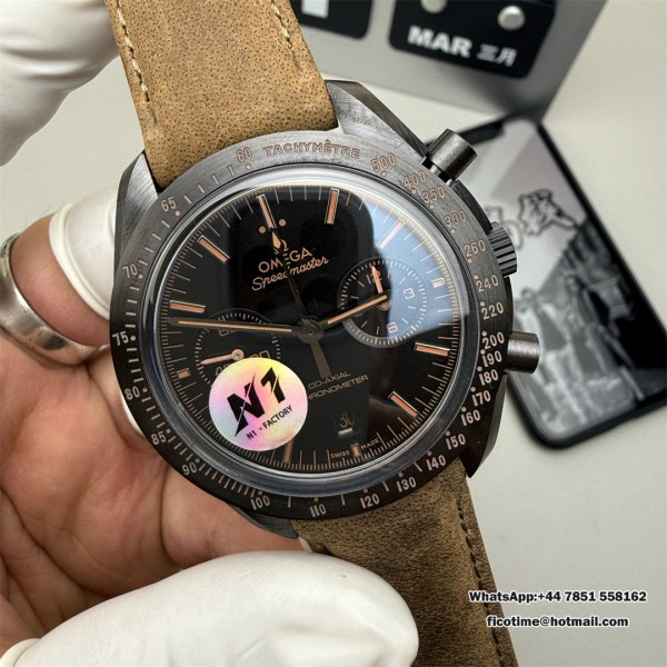 N1F A7750 Speedmaster 44mm “Dark Side of The Moon” Real Ceramic Black Dial Brown Leather Strap