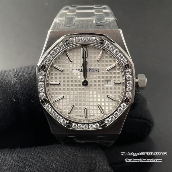 ZF Swiss Quartz AP Royal Oak 33mm 67651 Diamond Bezel White Dial SS Bracelet